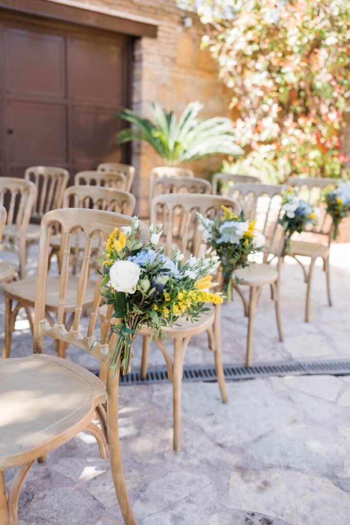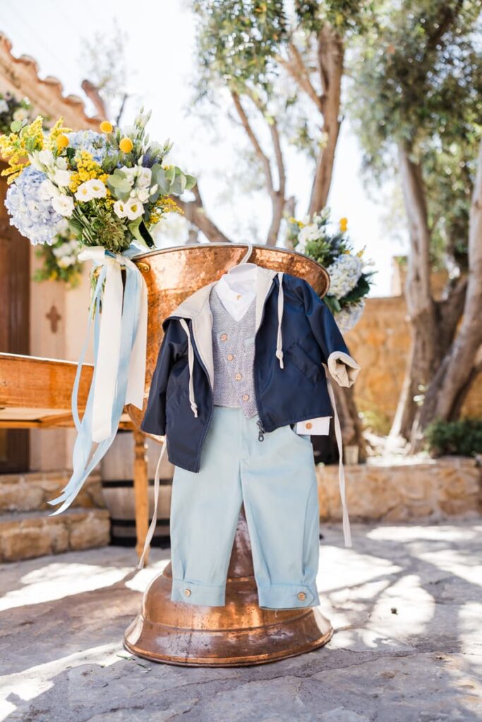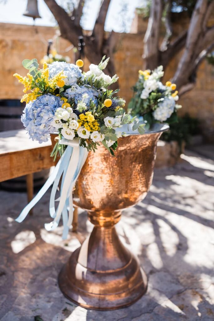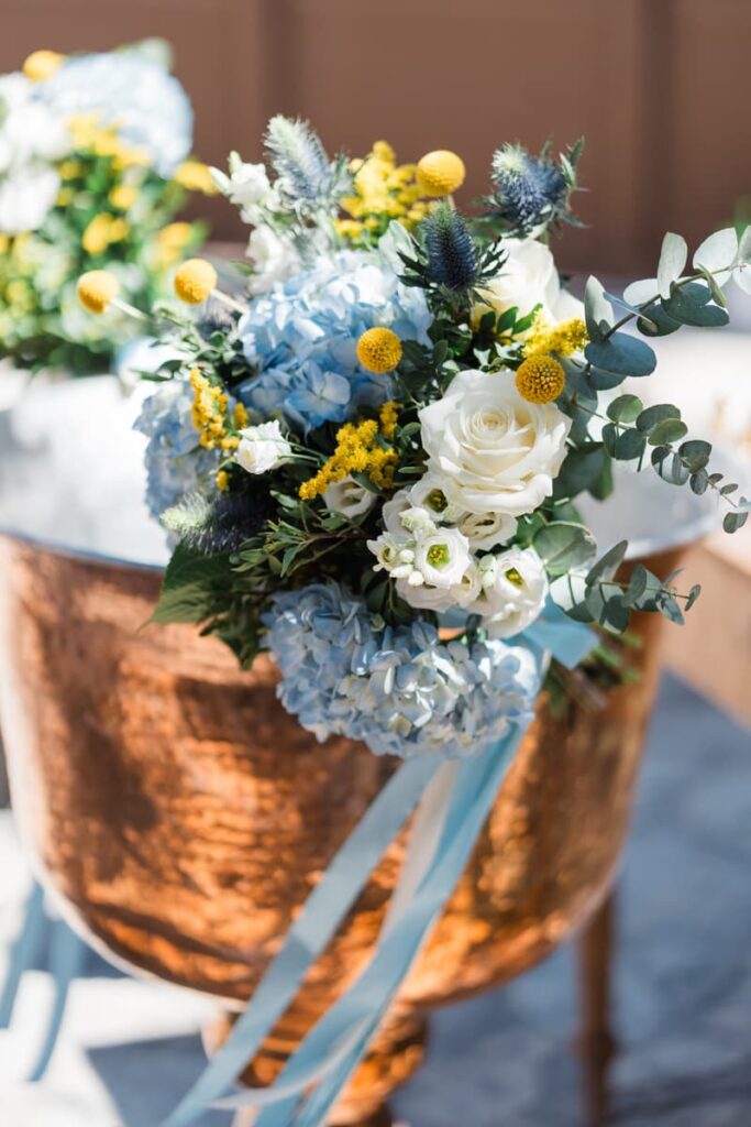 Ο στολισμός είχε κομψές αποχρώσεις του μπλε και του λευκού. Μπλε ορτανσίεςλευκά τριαντάφυλλα και κίτρινες πινελιές έδωσαν ζωντάνια στον χώρο. Παράλληλα, δημιούργησαν μια καλοκαιρινή αισθητική. Είναι κάτι που είδαμε και σε μια άλλη Βάπτιση στο Κτήμα Santa Maria που έχουμε φωτογραφίσει. Έτσι, κάθε γωνιά έγινε το τέλειο κάδρο.