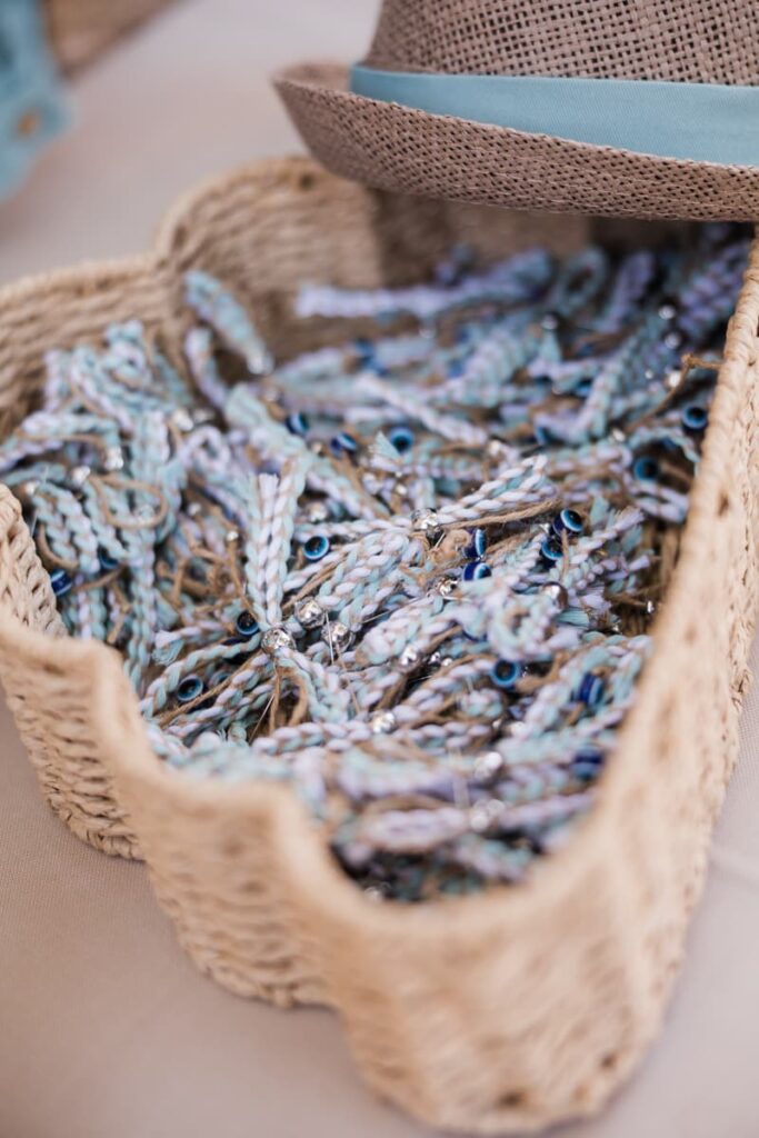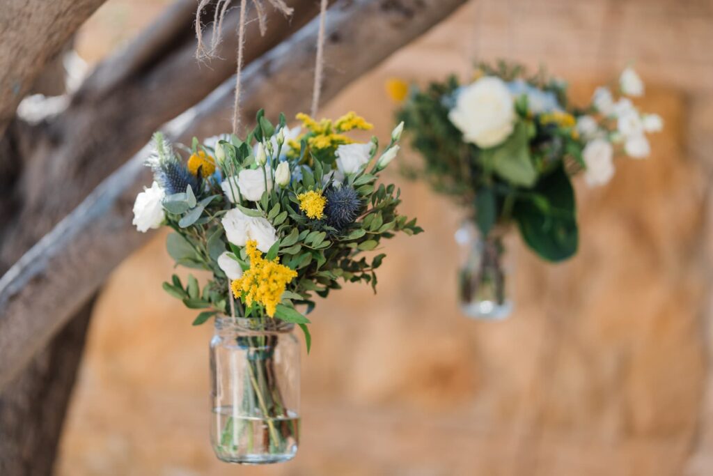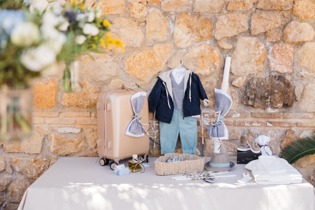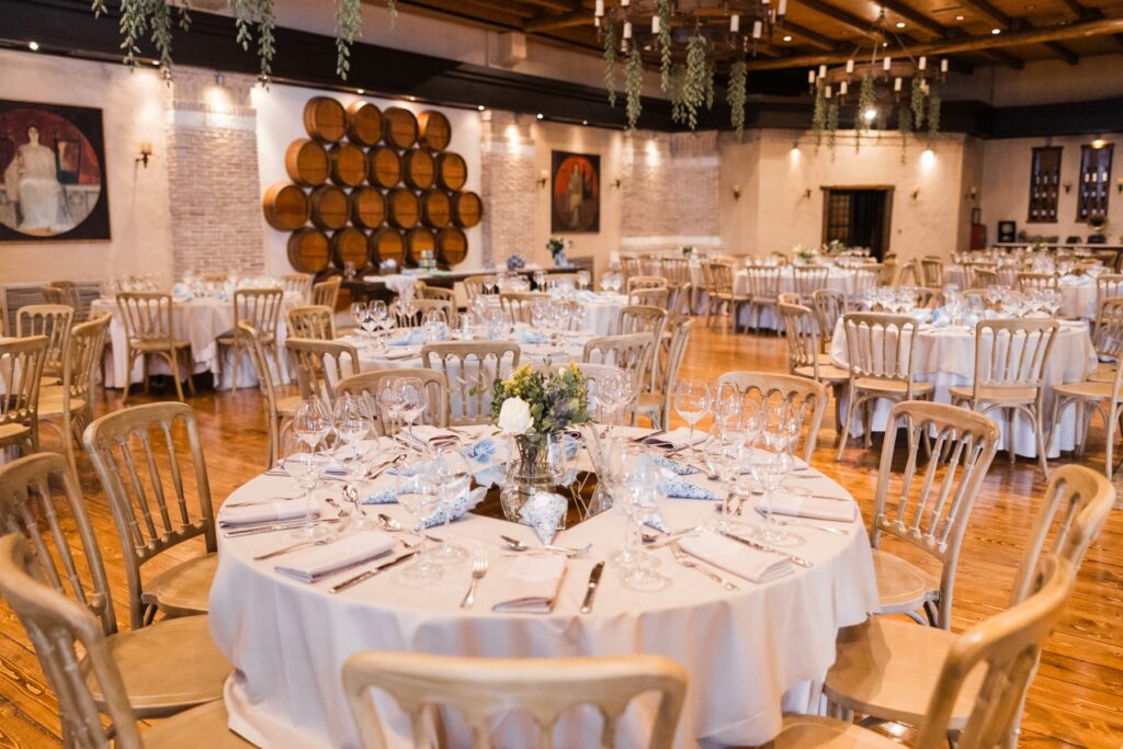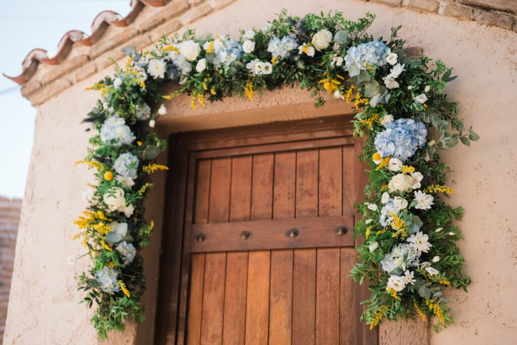 Ο στολισμός είχε κομψές αποχρώσεις του μπλε και του λευκού. Μπλε ορτανσίεςλευκά τριαντάφυλλα και κίτρινες πινελιές έδωσαν ζωντάνια στον χώρο. Παράλληλα, δημιούργησαν μια καλοκαιρινή αισθητική. Είναι κάτι που είδαμε και σε μια άλλη Βάπτιση στο Κτήμα Santa Maria που έχουμε φωτογραφίσει. Έτσι, κάθε γωνιά έγινε το τέλειο κάδρο.